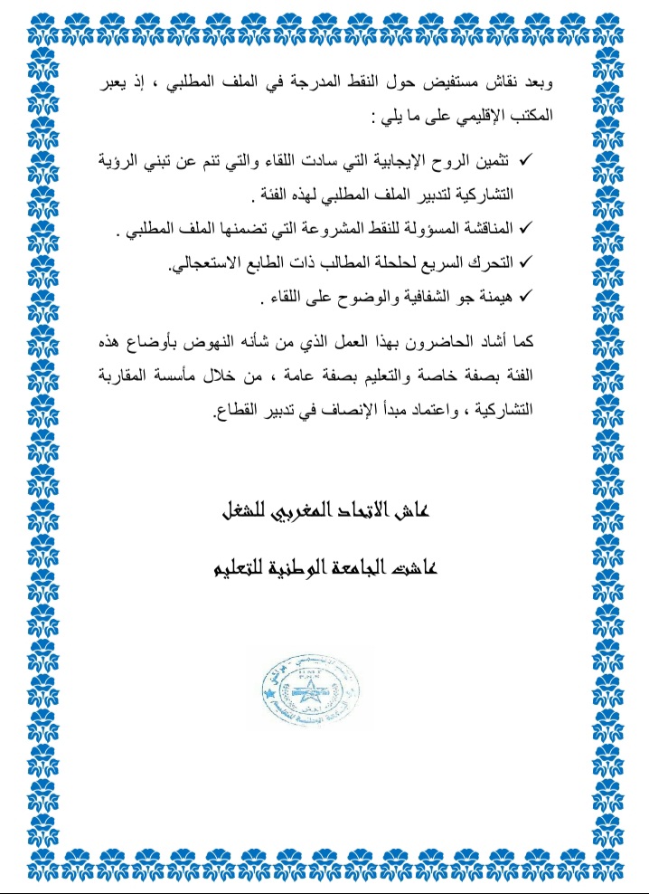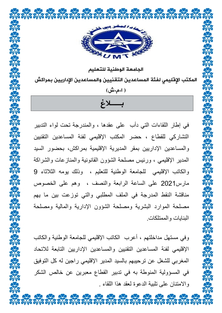 المكتب الإقليمي لفئة المساعدين التقنيين والاداريين بمراكش 11 مارس، 2021 0 نقابيات Facebook Whatsapp Twitter طباعة Post Views: 209